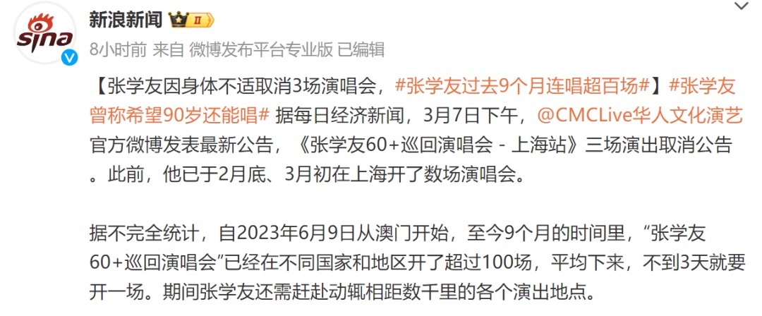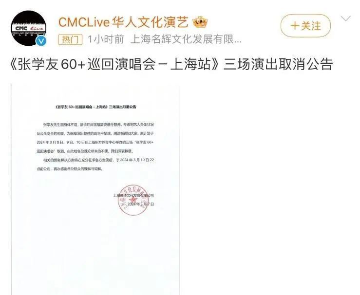 昨天,CMCLive华人文化演艺 发布公告,张学友巡演上海站三场演出取消,“张学友先生因身体不适,就诊后应医嘱需要进行静养,考虑到艺人身体状况及公众安全的前提,为保障演出整体的高水平呈现。至于相关票务的解决方案,则会在3月10日22点前公布。”