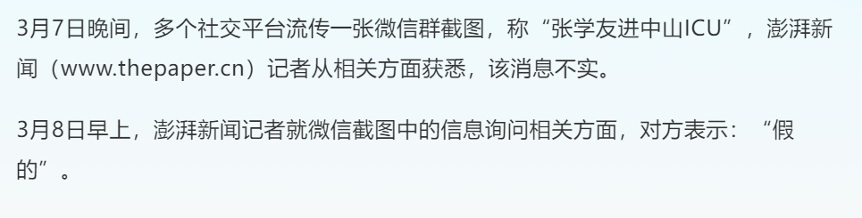 昨晚,网上出现张学友住进中山ICU的群聊截图。今早有媒体,针对网传张学友住进中山医院重症监护室一事,该院工作人员回应系谣言。