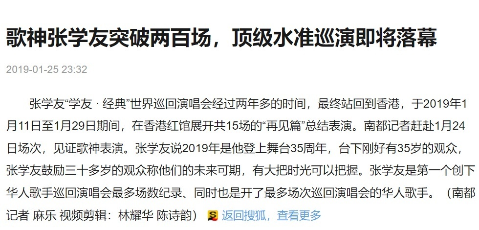 2019年,张学友的世界巡回演唱会经历两年多,更是恐怖地突破了200场。