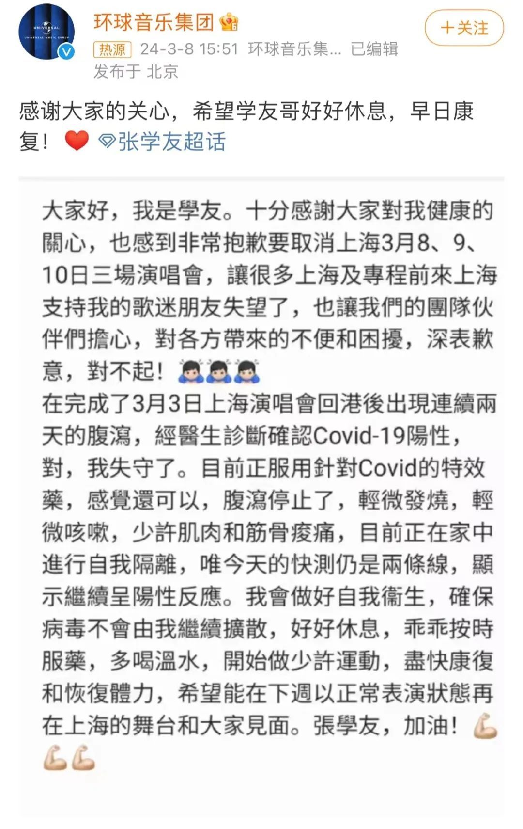 今天,张学友本人透过环球音乐报平安,他表示自己确认新冠阳性,目前正在服用特效药,“希望能在下周以正常表演状态再在上海的舞台和大家见面”。